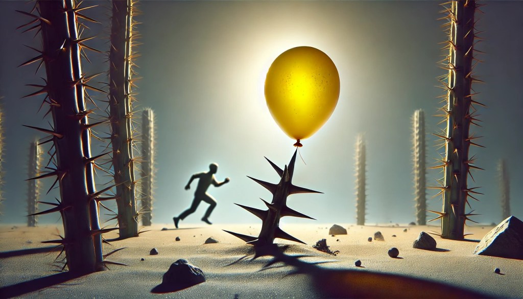 البالون الأصفر يتطاير فوق شوكة محددة. رأيت طرفها المدبب بعيني المفتوحة على آخرها وبالشهقة التي على فمي. أرى نصلها الحاد يلمع تحت الشمس الحارقة وينتشر ضوؤه ويملأ المكان. البالون الأصفر يقترب كثيرا من الأشواك وأنا الان غارق كالاعمى في هذا السيل الجارف من الشعاع واللمعان