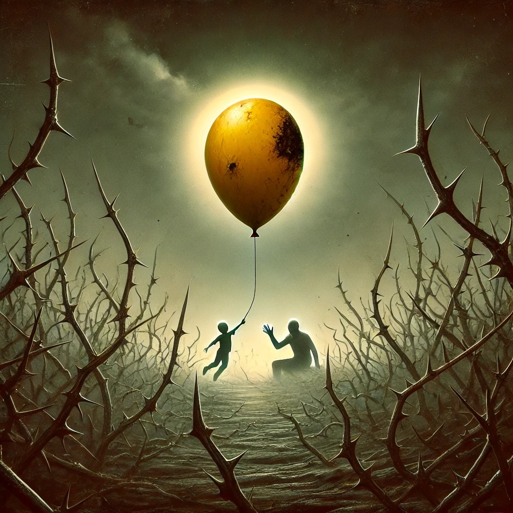 !البالون الأصفر يطيرُ فوق تَلّة مليئةٍ بالأشواك. بالوني