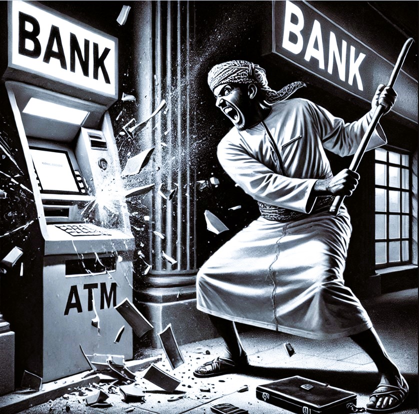 يُدَوّي في المكان صوتُ جهازِ الإنذار الجبّار الذي انطلقَ مُباشرةً بعد أن انهالت يدُ المدير على جهاز الصرّاف الآلي بالضربِ والتّكسيرِ المُتواصل بِعمودٍ حَديديٍّ اقتلَعه من طرفِ اللّوحة الإشهاريّة العملاقة التي تقع على واجهة مبنى البنكِ وتحمل شعاره المُلوّنَ مع صورٍ لأشخاص أنيقينَ يبتسمون للنّاظرينَ بثقةٍ كبيرةٍ وقد كُتبت فوقهم عبارةُ ” نحن نُحقِّقُ لك أحلامك”.