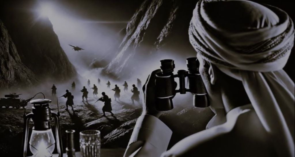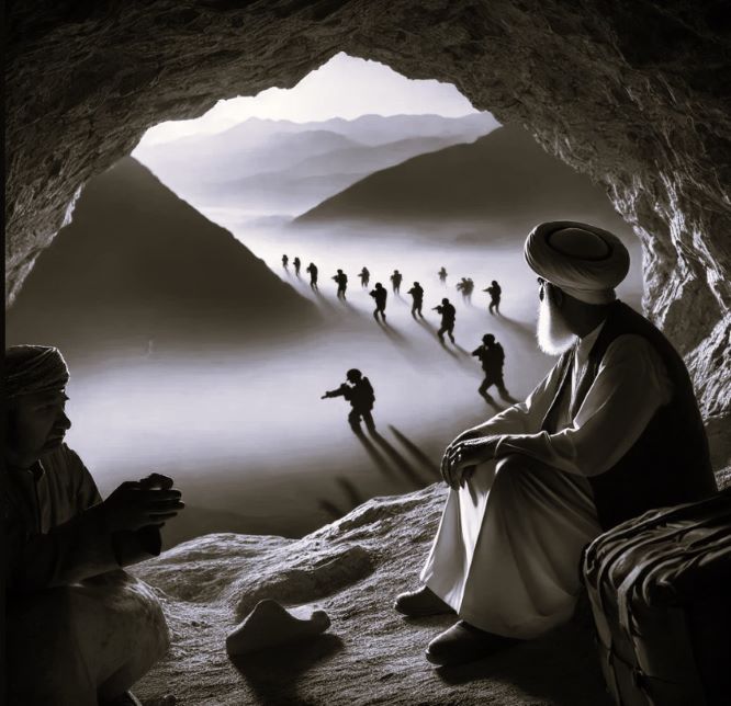 الشَّيخُ والجُندِيُّ جالسانِ في بؤبؤ عين الكهفِ القريبة من قمة الجبل في وضعِيَّةٍ مُتَرَبِّصةٍ يُراقبانِ أشباحَ القِطعِ العسكريّةِ للعدوِّ التي تناثرت على مسافةٍ قريبةٍ من سفحِ الجبل. الأشباحُ البعيدةُ للجنودِ الذين يتقدَّمونَ تَقعُ على مرمى بَصرِ الشّيخِ والجندي.