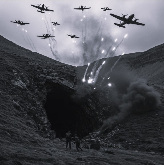 القَذائف تتساقط بكثافة من الطائرات المُحلّقةِ فوق الجبل وترسمُ خيوطا من الدّخان مُمتَدّةً من السّماء إلى فَتحةِ الكهف الذي في قِمّةِ الجَبل. خيوط الدُّخانِ المُمتدةُ بين عين الكهفِ والسماءِ تشبه رُموشًا دقيقةً لعين الكهف الضّيِّقة.