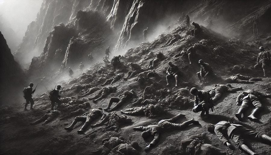 على الأرضِ، حيث احتشد الجنودُ قربَ سفح الجبلِ، تَلمعُ المناظيرُ المُكبّرةُ راصدةً أيّةَ حَرَكةٍ على قمةِ الجبل. المناظير تَتبعُ الانتقالات الحذرةَ للجنود الذين على القمةِ تحت رُموشِ الدُّخانِ مُباشرةً.